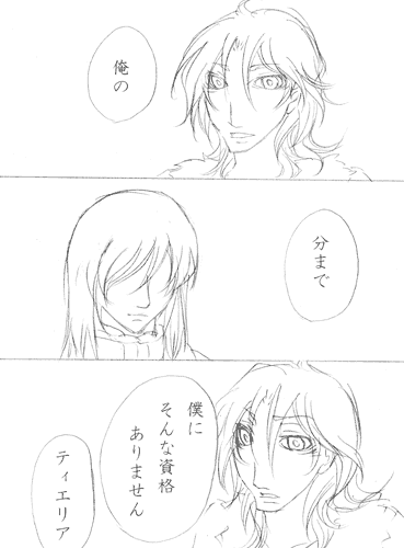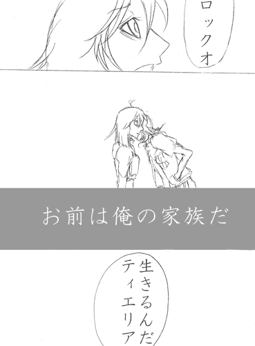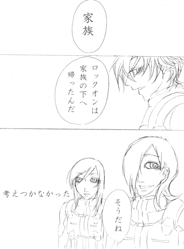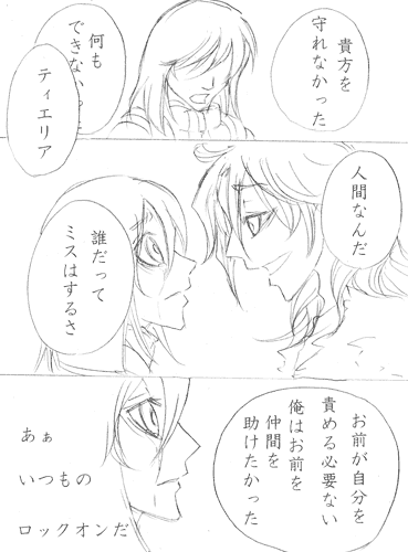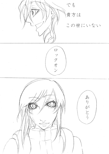 今更な注釈になりますが、ロックオンは、あえて眼帯つけませんでした。ティエリアが目の事を気にすると思い、ロクは眼帯を外してティエの前に現れました。幽霊ですがね。ティエの眼鏡は、眼鏡無い方が感情崩しやすい気がしたので、外しました(私が)。